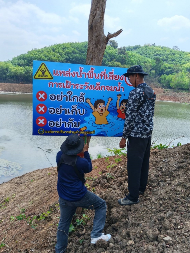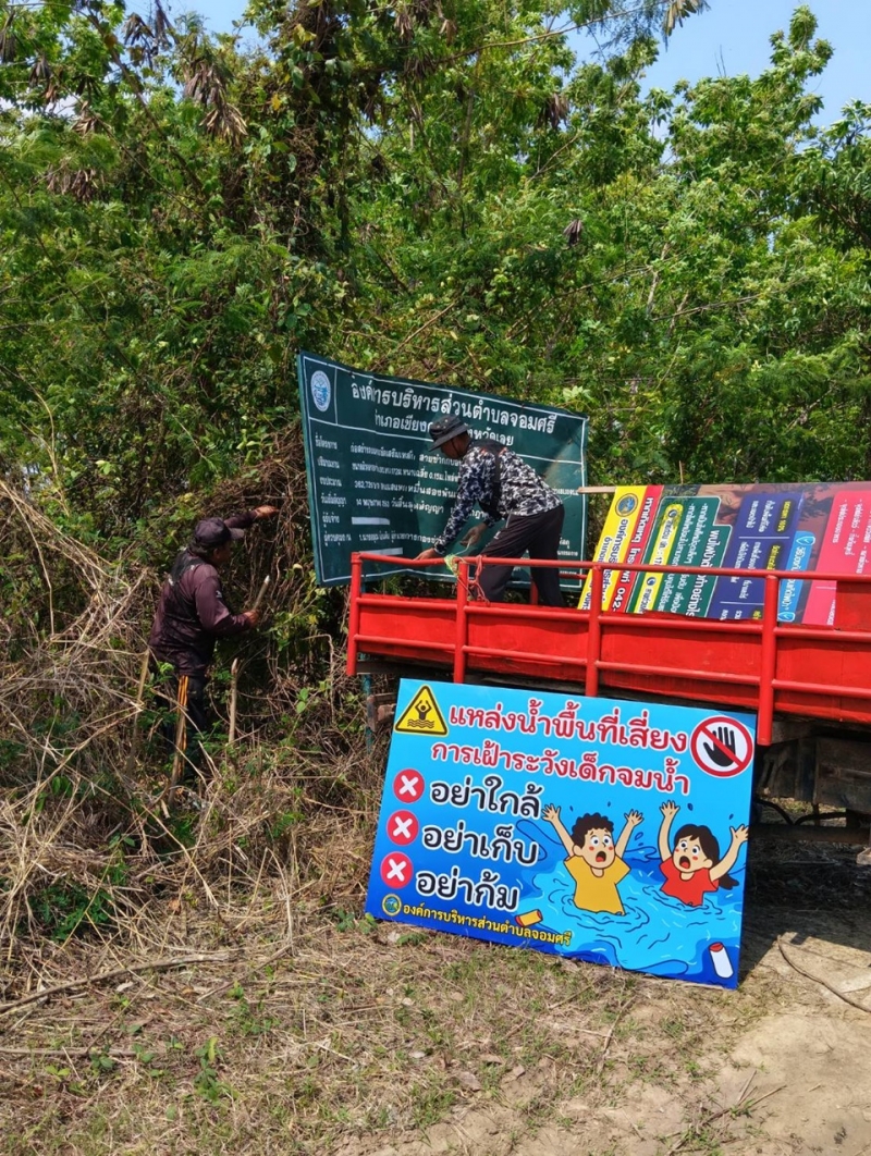 วันพุธ ที่ 4 มีนาคม 2569 องค์การบริหารส่วนตำบลจอมศรี ได้มอบหมายให้งานป้องกันติดป้ายแหล่งน้ำพื้นที่เสี่ยงการเฝ้าระวังเด็กจมน้ำภายในสระน้ำสาธารณะตำบลจอมศรี